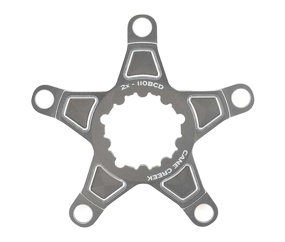 Der Spider zur Montage von 1 oder 2 Kettenblaettern an den Cane Creek eeWings All-Road und MTB Kurbelarmen. Bei der Montage von einem Kettenblatt haben Sei dank des 110 mm Lochkreises eine deutlich groessere Auswahl als bei den Direct Mount Kettenblaettern. Durch die Montage von 2 Kettenblaettern koennen Sie sowohl klassischen Rennraduebersetzungen als auch Gravel Uebersetzungen realisieren. Die 2 fach Abstufung ist kompatibel mit 10 und 11 fach Schaltungen. Als kleinstes Kettenblatt erlaubt der 110 er Lochkreis ein 32 Kettenblatt.