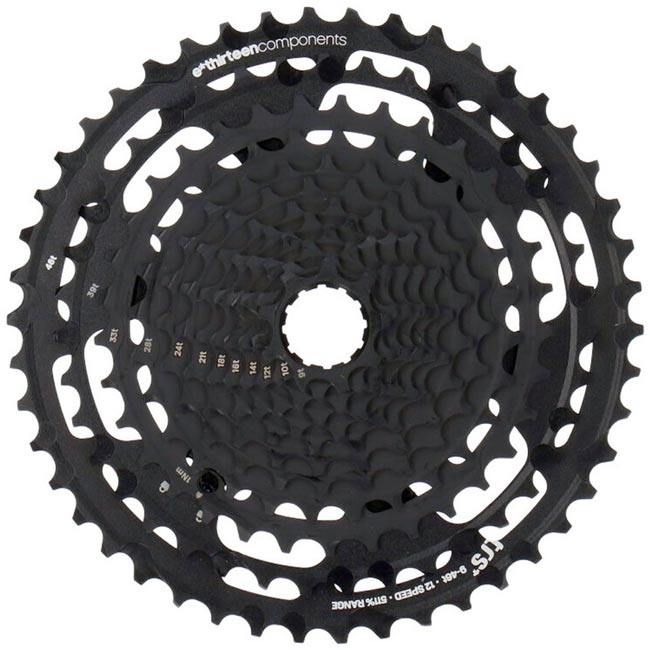 Die ethirteen TRS +12 fach Kassette mit der Abstufung 9,10,12,14,16,18,21,24,28,33,39,46 ist kompatibel mit Sram und Shimano Schalthebeln, Ketten und Schaltwerken.