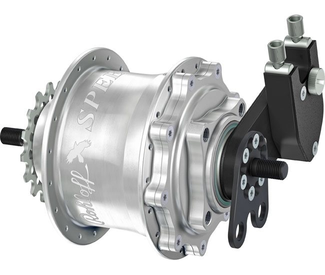 Die Speedhub fuer Scheibenbremsen. Achtung fuer die Nabe werden spezielle Bremsscheiben mit grosser Vierlochaufnahme benoetigt. Die externe Schaltzugfuehrung der Speedhub erlaubt unkomplizierte Montage der Bremsscheibe und der Schaltzuege. Mit der TS Achplatte wird die Nabe an der langen Drehmomentsutze befestigt.